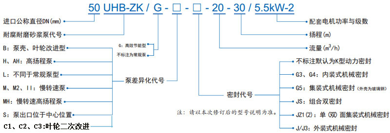 如果是改型的泵,在泵型号后面加注改型代号。例如:50UHB-ZK-A-20-30/5.5kW-2、50UHB-ZK-B-20-30/5.5kW-2。