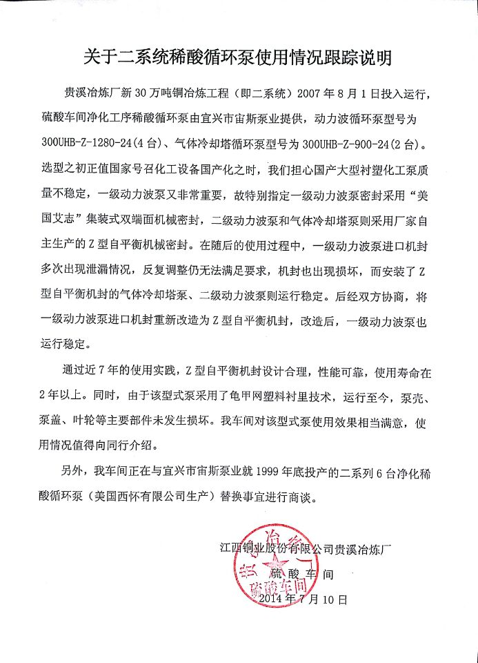 安徽铜陵有色集团多个子公司使用了宙斯泵业的工程塑料耐腐耐磨泵,反映良好,在新上的硫酸奥炉硫酸工程项目上因稀硫酸泵参数最大流量在2000m3/h以上,经将宙斯泵业泵与国外进口泵进行全方位对比最终确定选用国产泵。