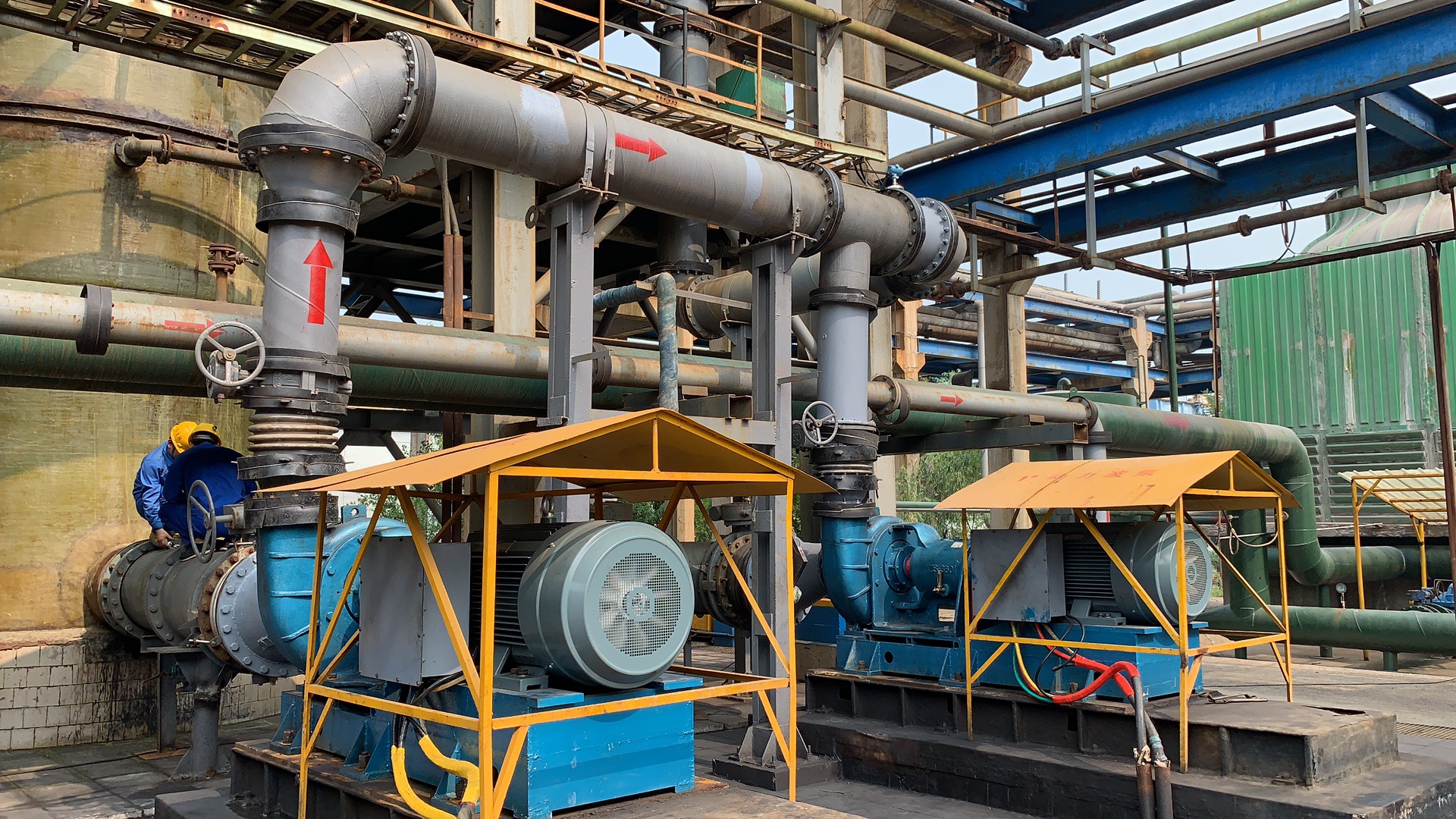 鉴于宙斯泵业稀酸泵在豫光集团股份有限公司硫酸工程上的使用效果,豫光锌业在对以硫酸老系统一、二期的技术改造时,也已更换了部分宙斯泵业稀酸循环泵,技改时间2019年初。下图为锌光锌业技改宙斯泵。