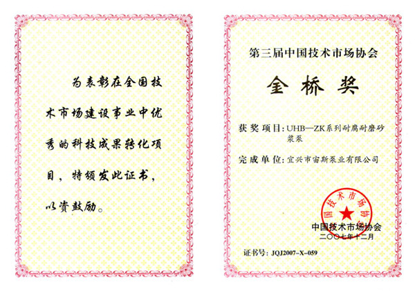 第三届中国技术市场协会金桥奖:UHB-ZK系列耐腐耐磨砂浆泵