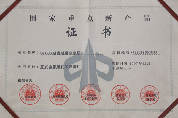 国家重点新产品证书:UHB-ZK耐腐耐磨砂浆泵