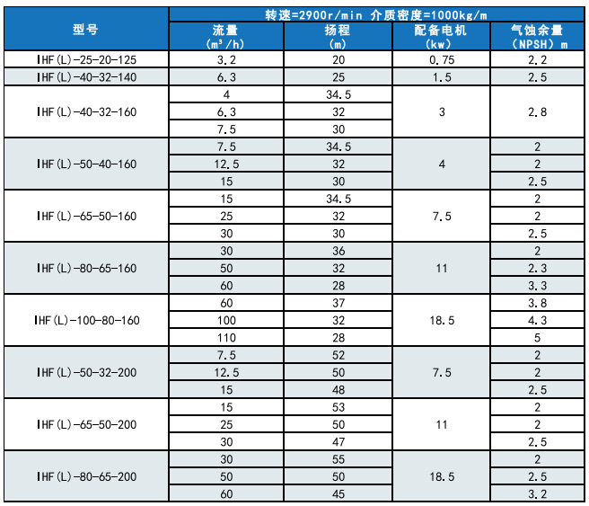 IHF (L)系列泵目前有10个规格,输送流量范围为: 3-110m3/h, 使用温度为: -20°C-110°C。 可应用于:化工生产中的腐蚀性介质输送、有色金属冶炼中的电解液输送及制药、石油、电力、电镀、染料