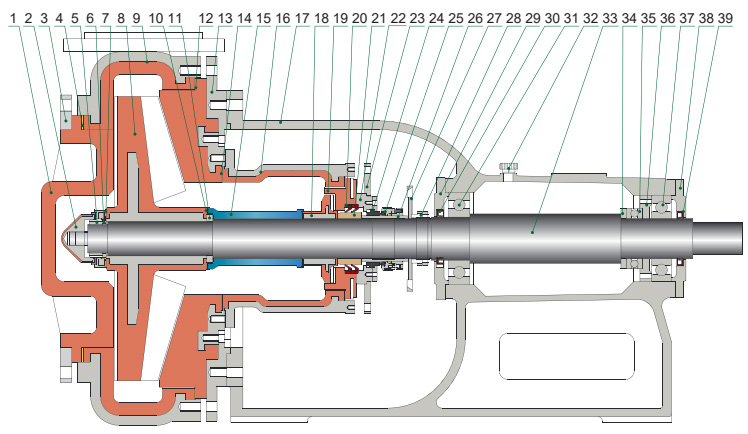 四. HFM-II型双级耐腐耐磨料浆泵的另一个优点是:耐磨性好,因为以较低的单个叶轮线速度,获得较高的泵出口压力,从而克服了单级料浆泵为增加压力而增加叶轮线速度,而导致叶轮、泵壳磨损加剧的缺点,有效提高了叶轮、泵盖等磨损件的使用寿命。