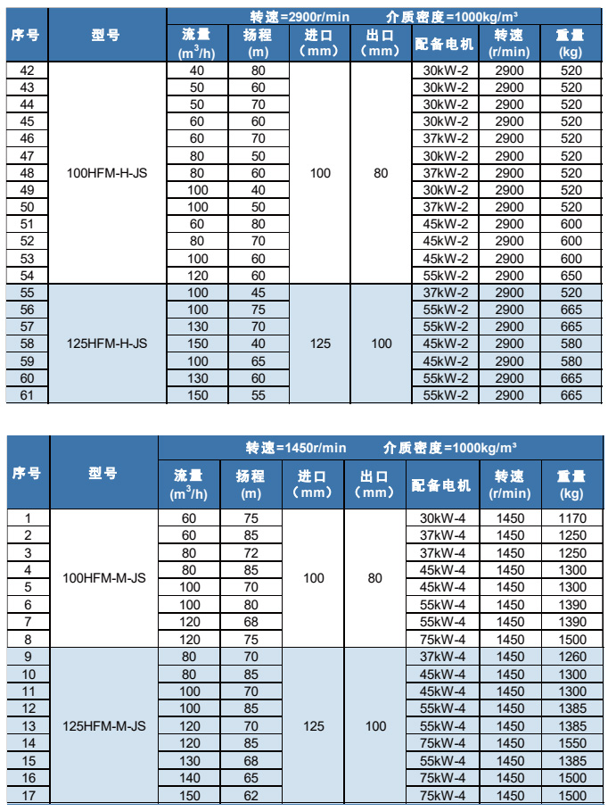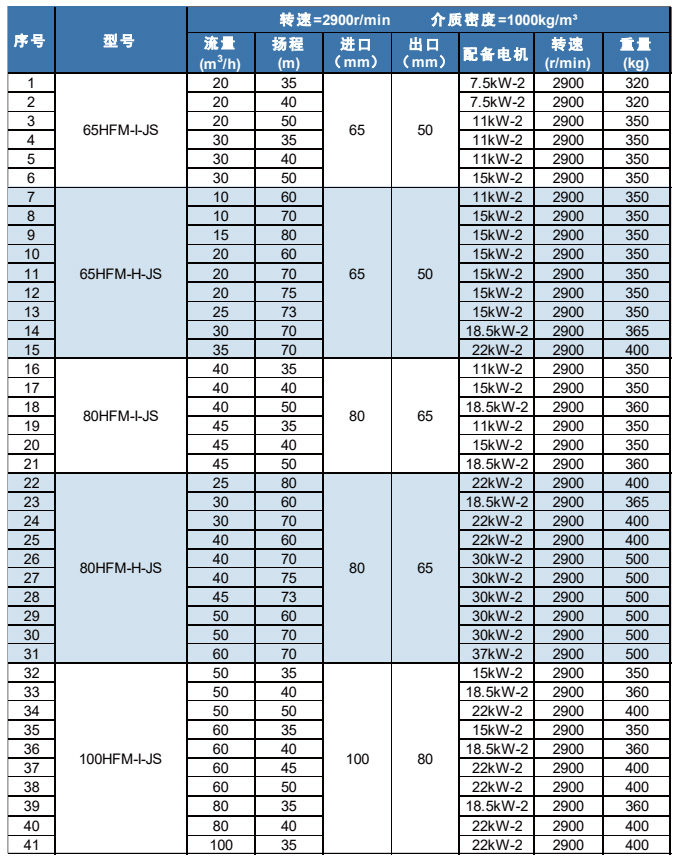 表中配备电机功率是在密度ρ=1时的参考值,实际电机功率应大于轴功率×介质密度ρ。