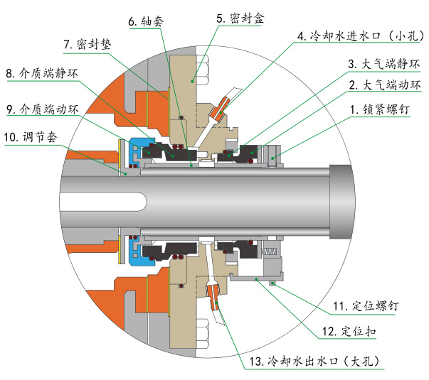① 密封的动环座、静环座全部采用氟塑料制作,动环、静环采用碳化硅制作,因此机封与输送液体接触的部件,都是耐强腐蚀的材质,克服了原有技术中机封局部组件材质不耐腐蚀的不足。因此改良后的XJ系列机封几乎可耐绝大数强腐蚀介质的腐蚀。