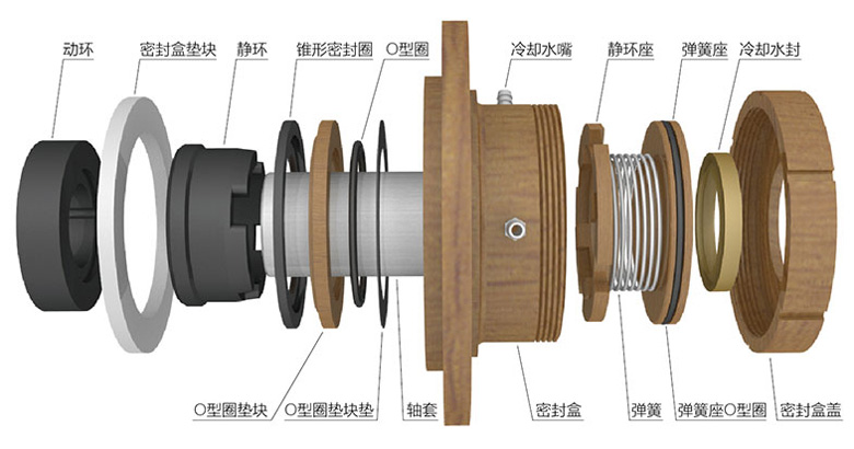 G4型密封组合大致有两种,一是密封盒垫块为螺纹型,密封盒无螺栓孔,通过密封盒压紧圈与泵壳联接紧固,详细结构如下图: