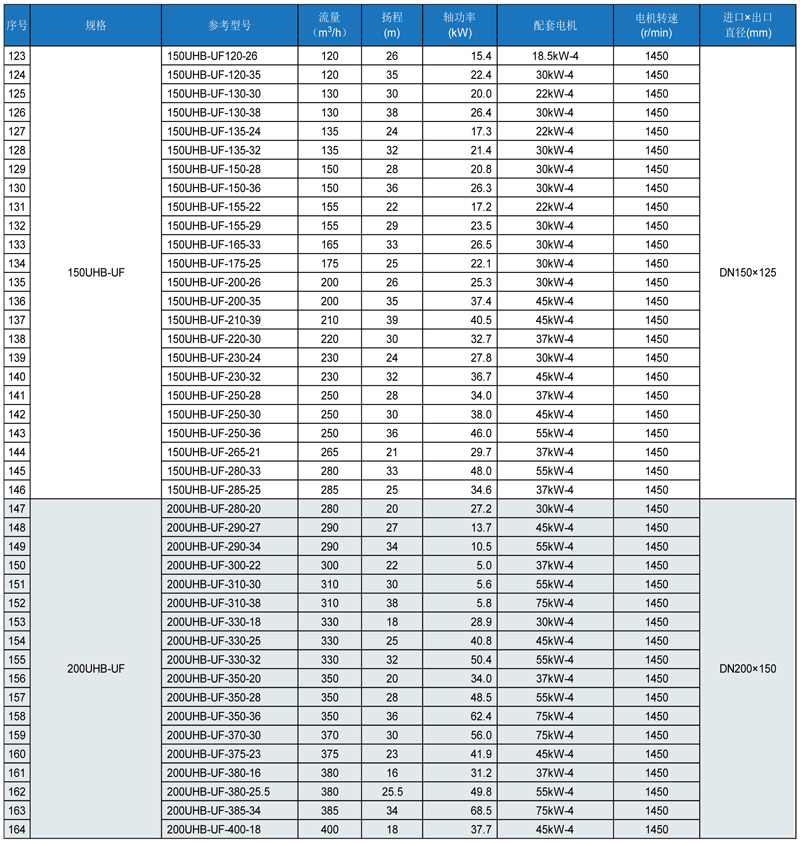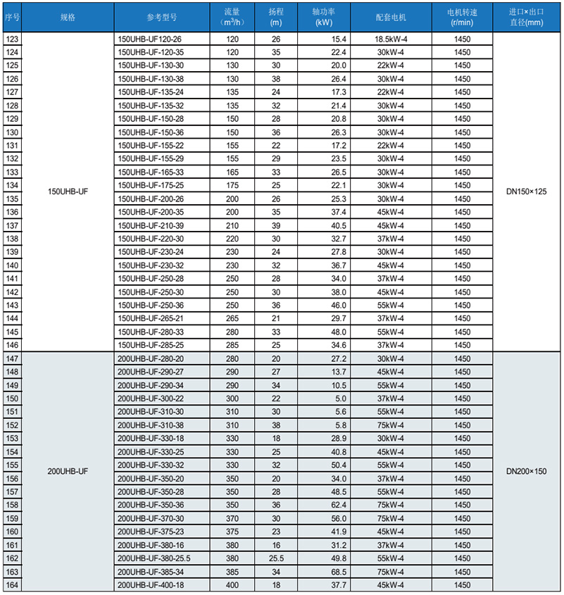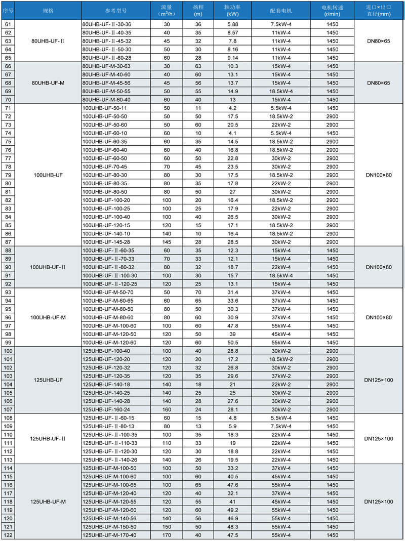 规格有:80UHB-UF-II、80UHB-UF-M、100UHB-UF-II、100UHB-UF-M、125UHB-UF-II、125UHB-UF-M、150UHB-UF、200UHB-UF。