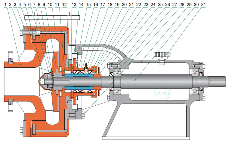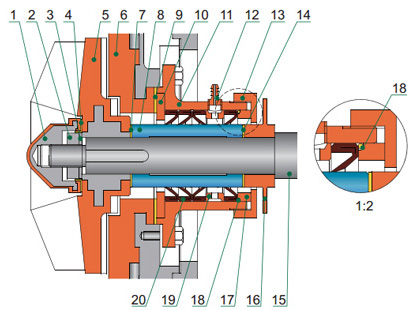 1、锁紧螺母 2、防转螺母 3、华司 4、锁紧螺母L垫 5、叶轮 6、泵壳 7、叶轮垫 8、轴套 9、密封盒垫 10、密封盒垫块 11、密封盒 12、冷却水嘴圈 13、密封盒盖 14、轴套垫 15、主轴 16、挡酸片 17、项圈 18、0形密封圈 19、水封环 20、K形密封圈