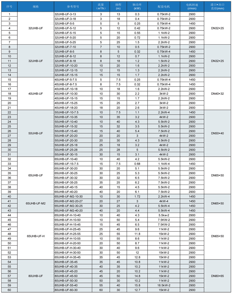 规格有:32UHB-UF、40UHB-UF、50UHB-UF、65UHB-UF、65UHB-UF-M2、65UHB-UF-H、 80UHB-UF、100UHB-UF、125UHB-UF。