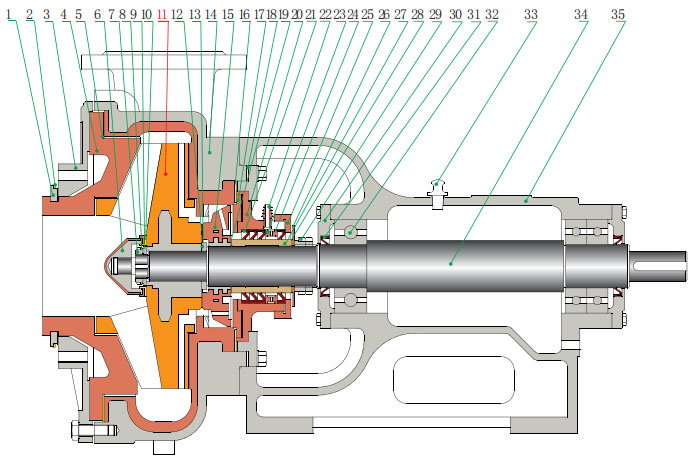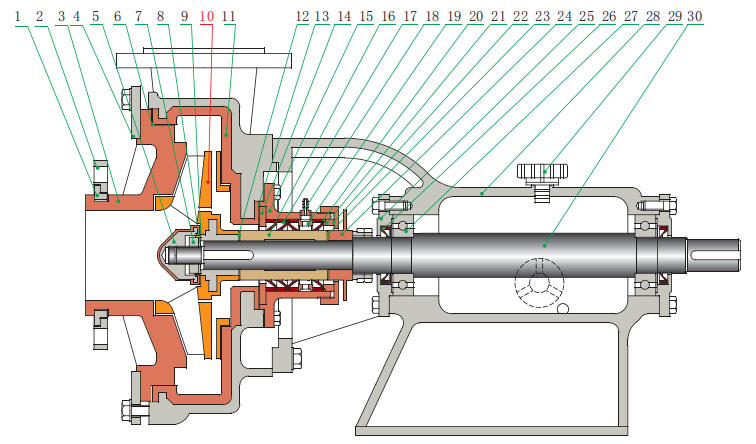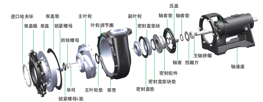 1、结构与特点:(1)耐腐耐磨,一泵多用,酸碱类清液料浆均适用。(2)泵体为钢衬超高分子量聚乙烯结构,衬层厚8~20mm,该泵应用了龟甲网衬里技术,和其它同类泵相比较,具有衬里层抗热变形性能好,耐开裂,防脱落,使用温度高等优势。(3)叶轮分开式,闭式二种,可根据介质状况任选。(4)密封:K型动力密封,G3、G4型机械密封。