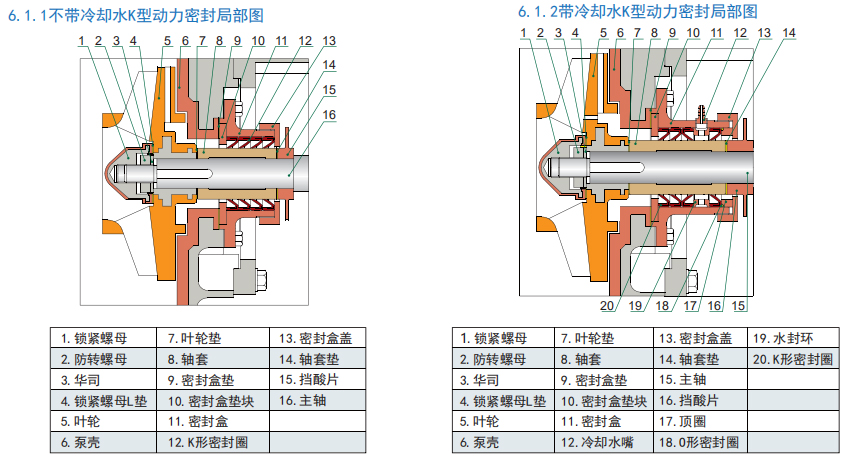 工作原理 该密封主要由叶轮幅板上排液孔与停车密封(K形密封圈)组成。工作时叶轮旋转产生的离心力使密封部位的介质通过叶轮幅板上排液孔排出,从而使密封腔处于负压状态,阻止液体向外泄漏,此时,停车密封不起作用。K形密封圈的唇口因负压而松开,与轴套产生一定间隙,减小了其之间的磨损,延长了使用寿命;停机时,由于叶轮停止旋转,密封腔由负压转为正压,停车密封开始工作,K形密封圈的唇口在压力作用下紧紧包住轴套,从而达到密封目的。若允许冷却水渗入介质内,可选用带冷却水K型动力密封,即可添加外冷却水装置,延长密封圈的使用寿命。该密封的密封圈采用氟橡胶制成,主要适用于输送含固体颗粒的料浆、含杂质的污水等腐蚀性介质(带冷却水K型动力密封用的冷却水为洁净的自来水,压力适宜在0.05MPa以内)。