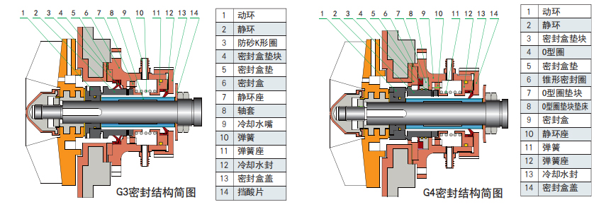 G3密封为本公司自行设计的一种改良型抗颗粒泵用机械密封;密封的动、静环均由碳化硅或硬质合金制成,可用于输送含大量颗粒的腐蚀性液体。该密封和同类内装式机械密封相比,静环与密封盒之间设置了挡砂圈,硬颗粒不能进入静环与密封盒之间的间隙中,使静环前后位移自如,克服了原有耐颗粒密封的“卡砂”失效的缺点。G4密封是对G3密封防砂K形圈部位的进一步改进,性能更加稳定可靠。G3、G4密封均为本公司开发的品种技术。