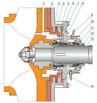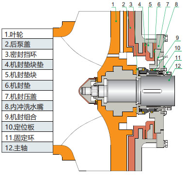 双端面集装式机械密封有着使用寿命长、运行稳定、安装维修方便等优点,适用于目前绝大部分烟气脱硫循环岗位。其独特的内冲洗系统在提供润滑、冷却作用的同时,有效地防止了固体颗粒杂质堆积在密封环上,延长了密封的使用寿命。