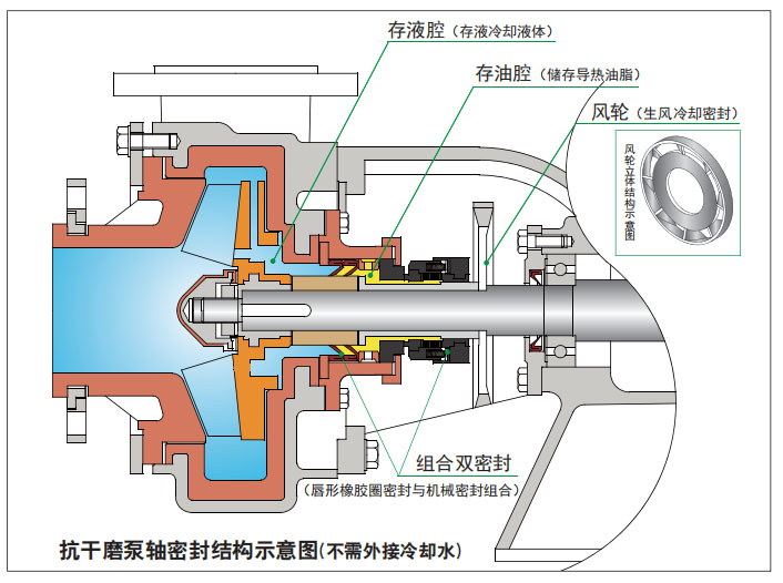 其工作原理为:动力密封在前挡砂,起到密封砂浆的作用,机械密封在后密封存油腔中的存油,村油起到润滑机封的动静环和轴套与唇形橡胶密封圈的作用。与此同时,又起到传递热能的作用,即密封部位的热量传导到密封外侧的散热装置上。散热装置包括散热片,风轮的功能是在泵机运转时把密封部位的热量散布出去,保证轴密封安全运行。JS组合双密封的科学性就是把各单一组件的独立功能组合联系起来,使他们互相配合,互相作用,功能互补,相互依存,形成一个整体的、有润滑功能的、有冷却功能的、有挡砂功能的、有停车开车均有防漏功能的,同时还可以适当开空机的先进的密封整体。