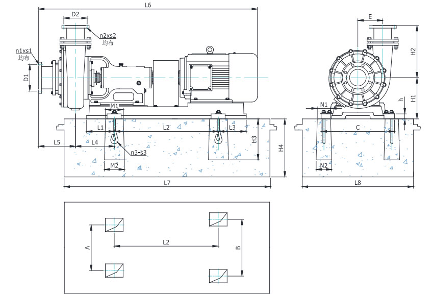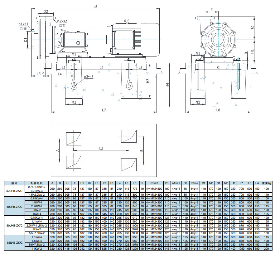 注:1. 表中基础安装尺寸(A/B/L2)保证与泵底座匹配连接;基础土建尺寸(L7/L8/H4)仅供参考,实际施工请以工程设计要求为准。