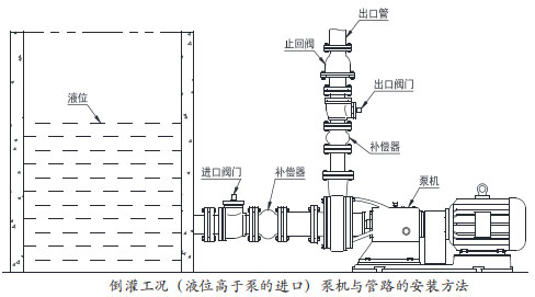 (13) 泵的进口应尽量靠近液源,推荐采用倒灌工况,吸上工况需配虹吸桶使用;两种常见工况的安装方法如下图: