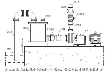 (14) 如下图,吸上工况要尽量减少进口管路的水力损失,不得装小于90°的弯头,90°的弯头不要超过2个;泵进口应设置滤网,防止大块杂质堵塞进口;进口管路连接螺栓要对角均匀拧紧,防止漏气;虹吸桶底部应设置底座用于承重,绝不能悬空安装;一泵配一桶,不能多台泵同时共用一只虹吸桶;如果是备用泵共用虹吸桶,泵进口前都应安装阀门。