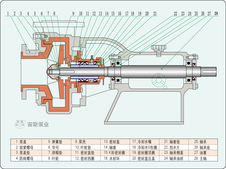 | 4 | 防转螺母 | 8 | 叶轮 | 12 | 密封盒垫块 | 16 | 水封环 | 20 | 密封盒盖 | 24 | 轴承油封 | 28 | 主轴 |