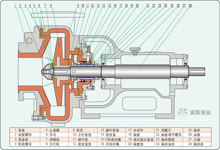 | 2 | 锁紧螺母 | 6 | 华司 | 10 | 叶轮垫 | 14 | 轴套 | 18 | O形密封圈 | 22 | 挡酸片 | 26 | 轴承座 |