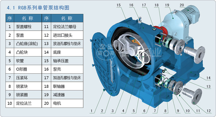宙斯泵业RGB系列软管泵(又称蠕动泵、脉动泵)是通过滚轮或者滑块挤压胶管来工作的。泵可以干转,自吸以及处理高粘度、高磨损介质。泵体无须密封,完全无泄漏,并且每次旋转都能输出固定流量的容积泵,具有转速低、无噪音等特点,用途较为广泛,应用于冶金、稀土、脱硫环保、水处理、造纸、油漆、钛白粉、复合肥等行业。该系列泵有单管和双管两种形式,可作为清池自吸泵、压滤机泵、泥浆泵使用。