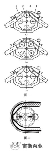 其工作原理见图一,是由软管1,装在转子3上的滚轮2和泵壳4等零部件组成。当转动转子时,由滚轮和泵壳夹挤形成的软管内腔A从生成开始逐渐增大,此腔处于吸液状态。转子转至图b位置时,已进入A腔的液体,被滚轮挤送至封闭空腔B,到图c位置时,这部分液体又被挤送到与泵出口相通的D腔,进而排出泵外。转子连续转动,便形成软管的连续"蠕动",将液体从泵的低压入口不断地向高压出口输送。