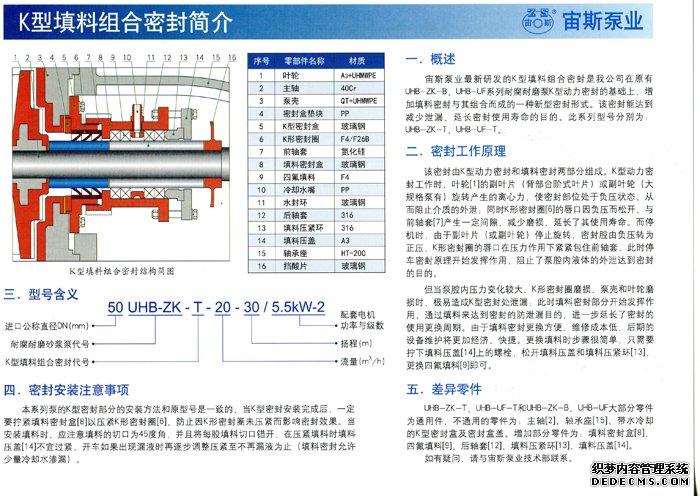宙斯泵业为了满足用户的要求最新研发了K型密封、填料密封组合的一种新型的密封形式,它能有效的利用K型密封的开车不泄漏的特点,同时又能使K型密封在使用后期出现停车漏液时,利用填料密封的维修方便的特点,延长密封的使用周期从而节约维护费用,两者优势的结合使其密封寿命更长、维护更方便、维护费用更低。