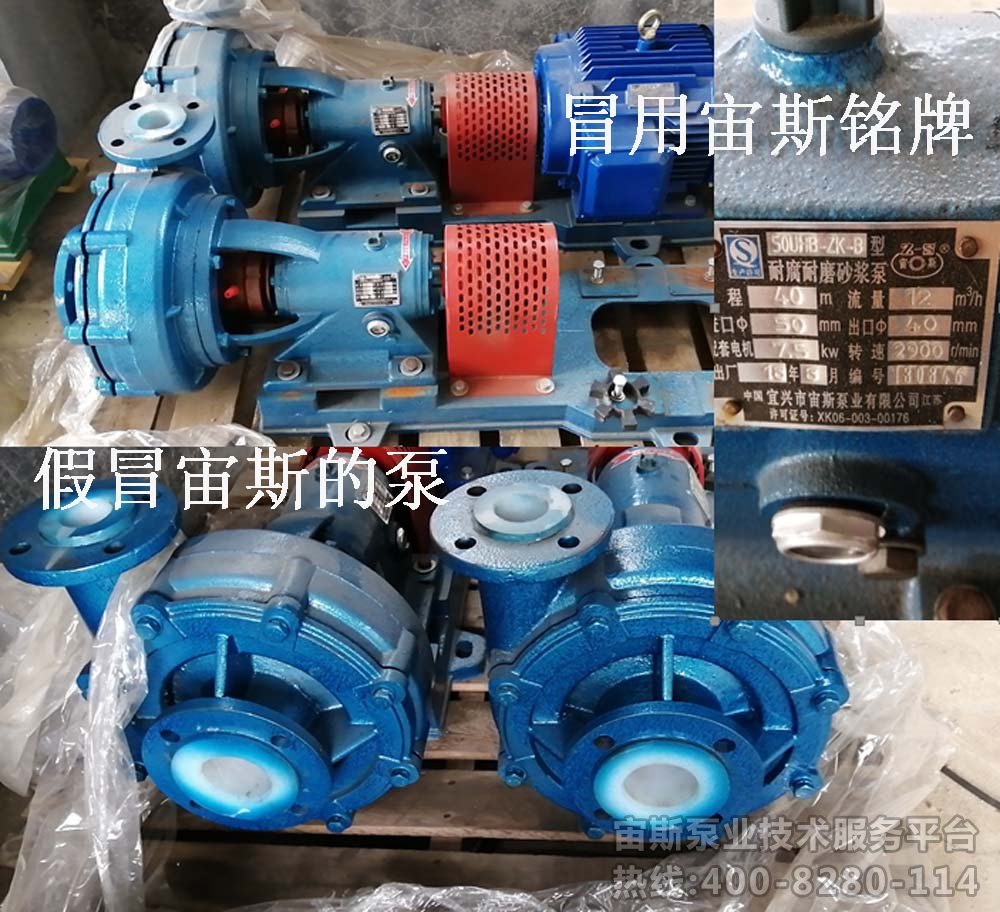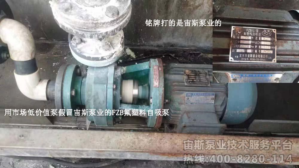 下图一化工企业原指定宙斯泵业品牌的耐腐蚀氟塑料自吸泵,经由中间流通环节造成贴牌,后直接用户向宙斯举报 湖南一冶炼企业,通过其中间商供货渠道购买的帖牌假冒产品