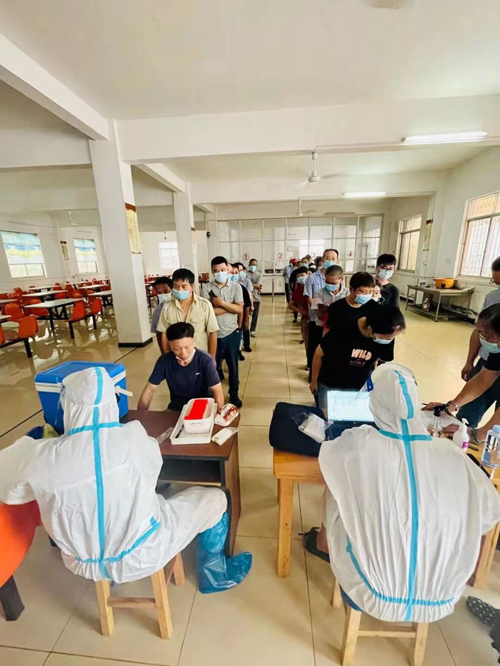 图为:宜兴市宙斯泵业员工在公司食堂临时检查点进行新冠病毒检测