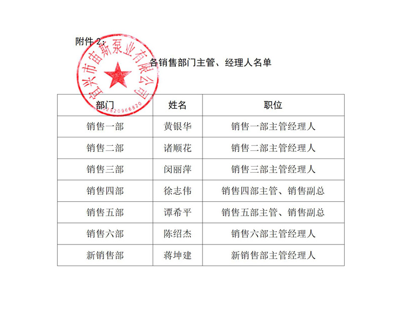为与新的法律法规接轨,保障公司的经营安全,理顺销售从业人员在销售工作中的称谓,方便公司日常工作展开,规范管理流程。现对公司销售队伍中相关人员的职务明确,并通过www.zsbyw.com宙斯泵业官网公布:1、对2023、2024两年平均销售进账超1000万元以上的专职销售员任命为销售副总1;2、对现有各销售部门主管、经理人员再明确一下,具体名单见附件2。以上人事任命,于2025年05月30日正式生效!