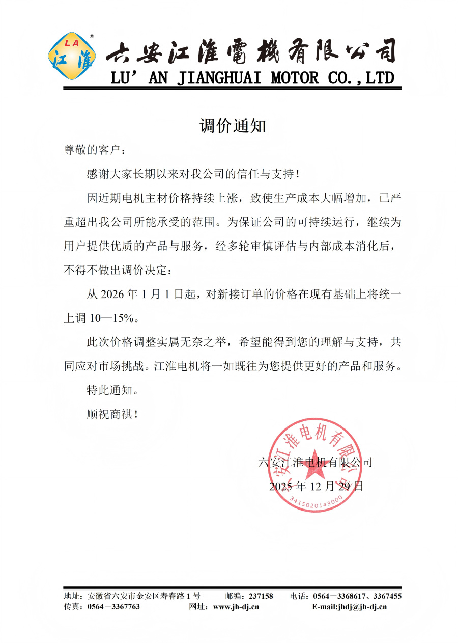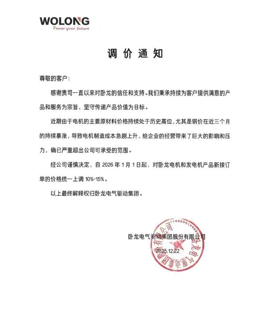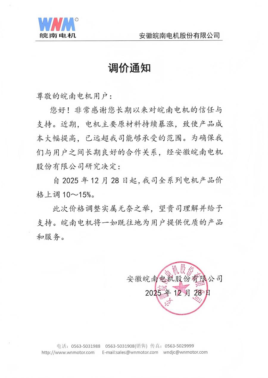 近期,由于电动机生产核心原材料价格持续暴涨,铜价较年内低点涨幅超 40%,铝锭、电磁线等关键材料价格亦同步大幅攀升。与我公司耐腐泵配套供货的各电机厂难以支撑原材料上涨带来的成本上升压力,相继调价,具体如下:
