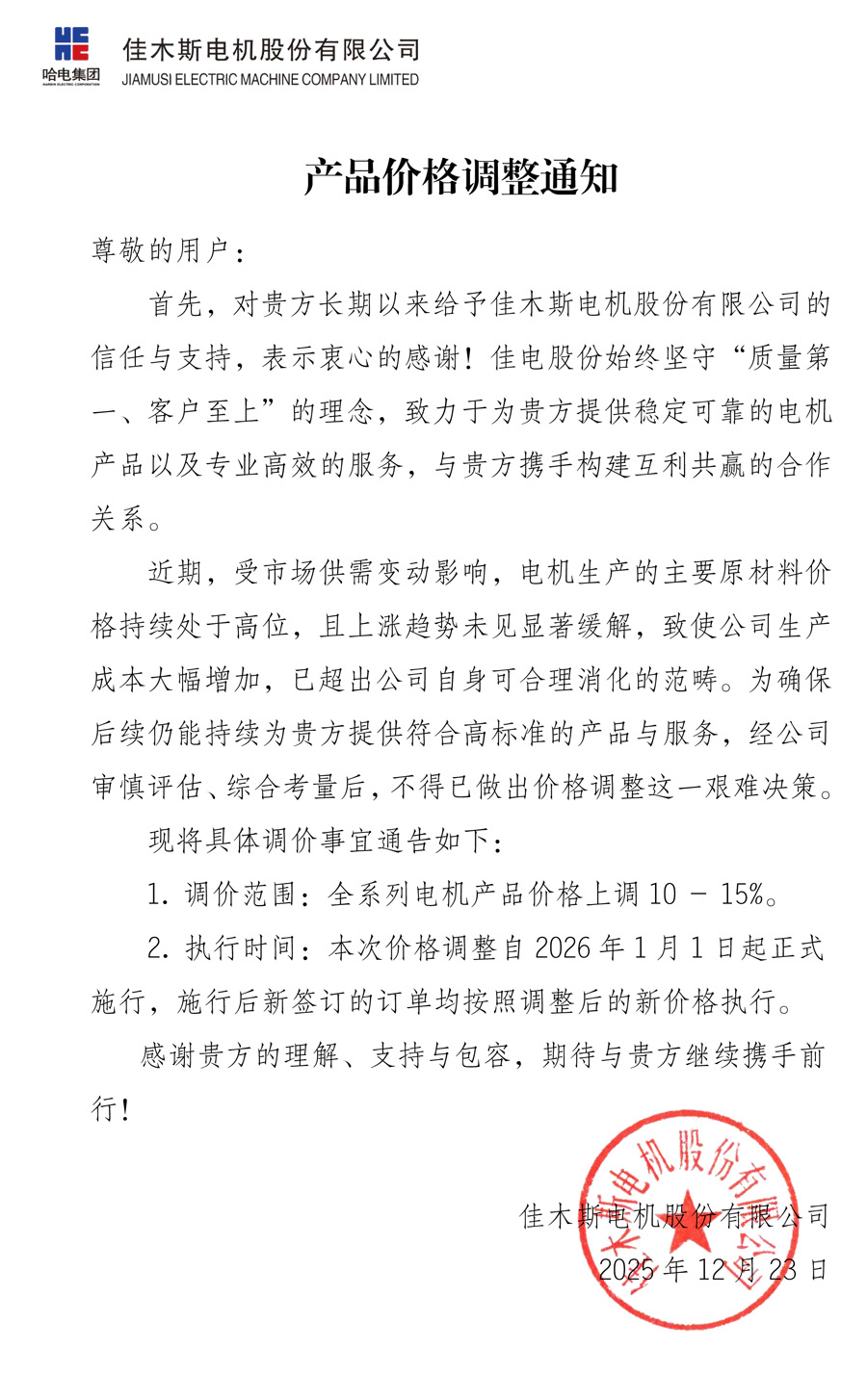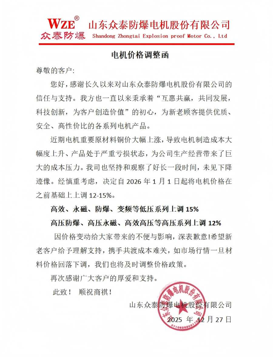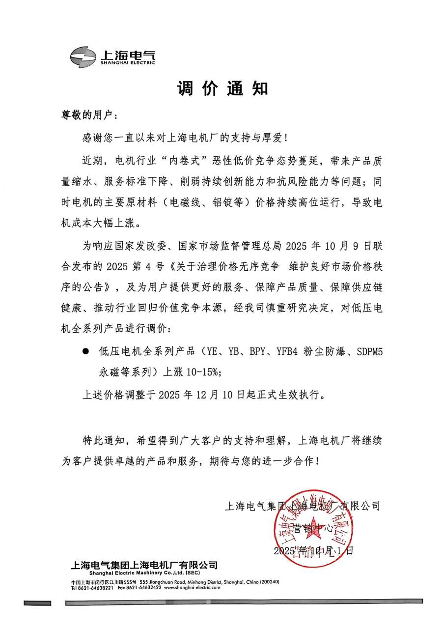 一、调价范围:全系列电动机产品(含 YE3/YE4/YE5 高效节能系列、YBX3/YBX4 防爆系列、永磁同步系列、高压电机等);
