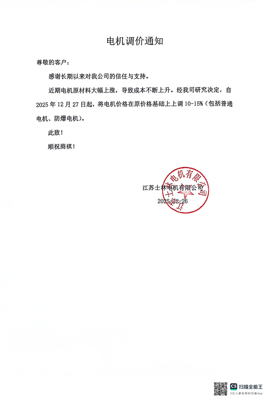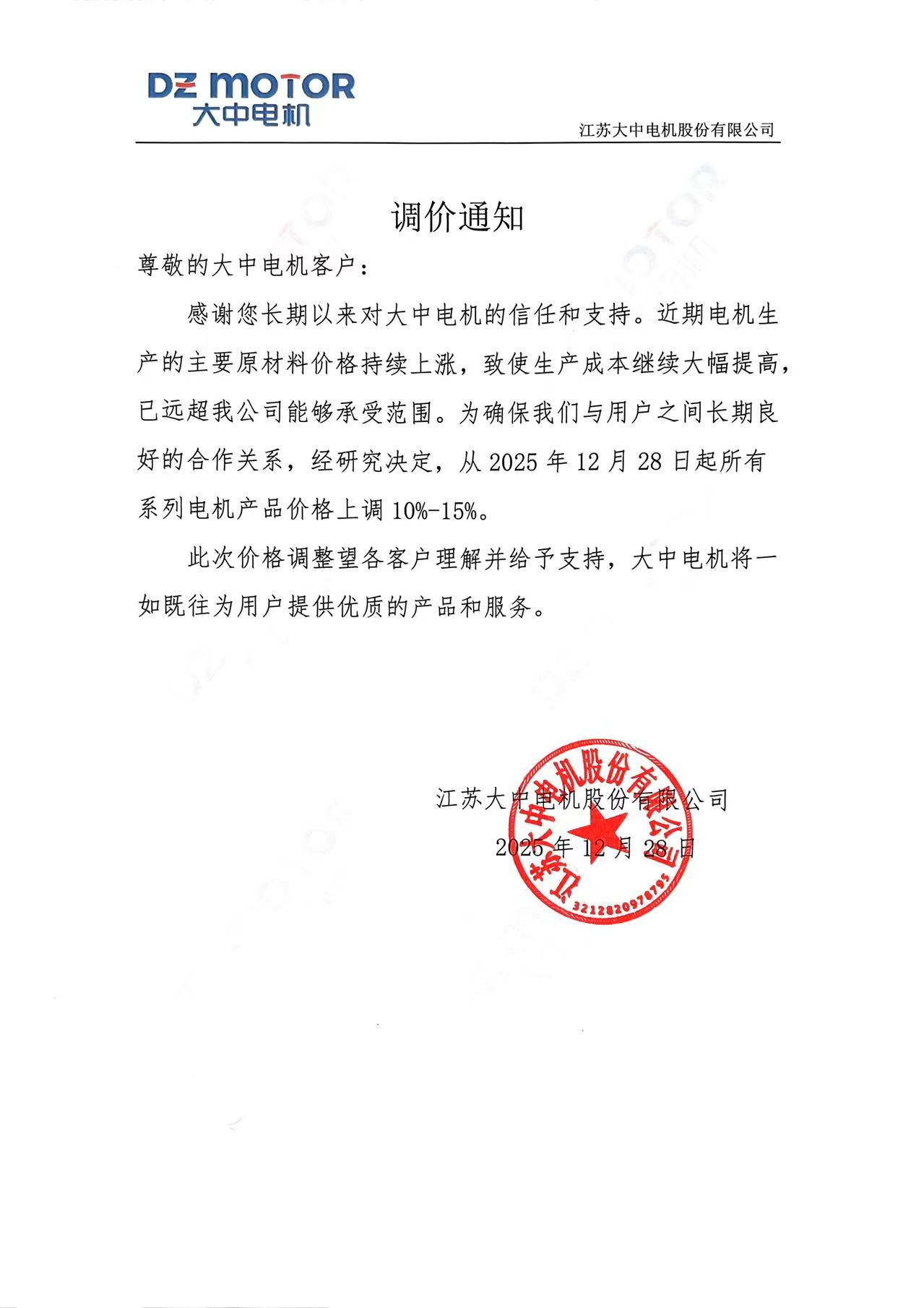 部份配套电机厂调价通知(点击图标查看原件)